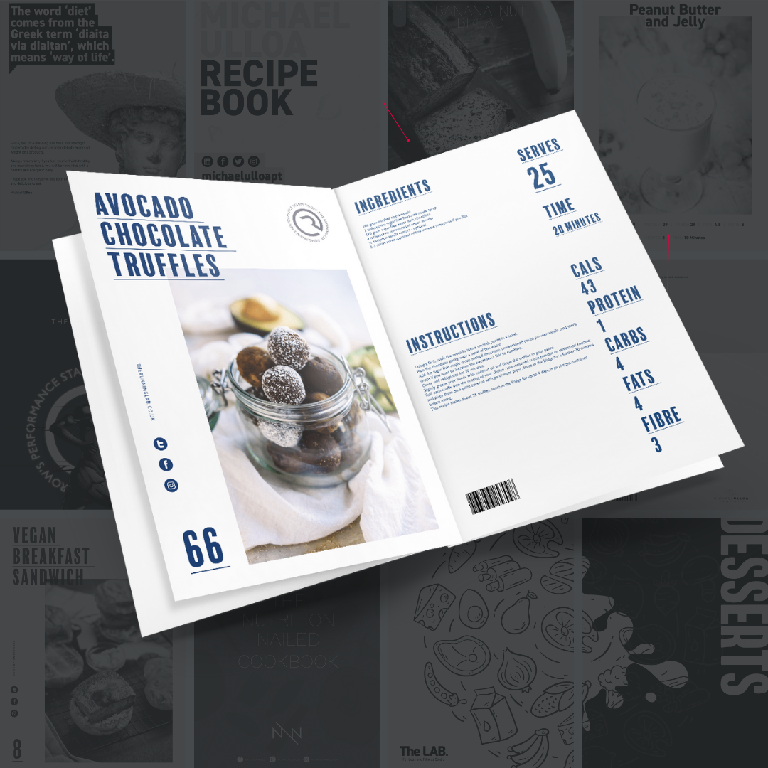 12 Fully Bespoke Recipe Books, each containing 30 recipes for breakfasts, sides and small dishes, main courses, and desserts. All macro counted and featuring MyFitnessPal barcodes on each recipe.